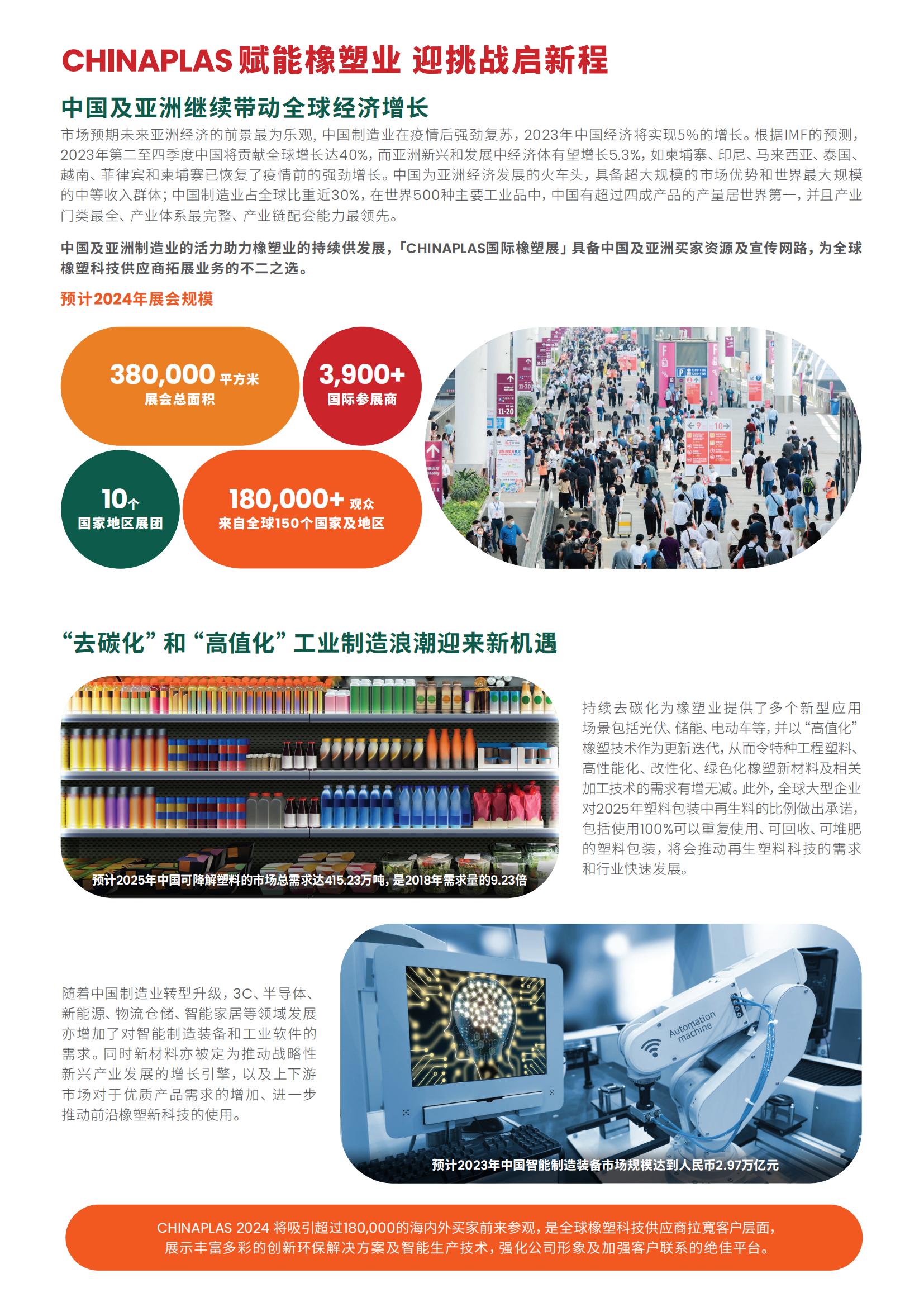这些骄人发展,预示了中国橡塑市场前景光明,催生了国内高性能塑料材料和高新技术的庞大需求。这种转变的局面凸显了循环经济、数字化和“中国创造”的重要性。“CHINAPLAS 2024 国际橡塑展”作为亚洲领先的橡塑展,将与全球超过4,000家优质展商携手在上海国家会展中心(虹桥)的15个展厅,以逾38万平方米的展示面积,为买家带来橡塑领域顶尖智慧成果。透过展示一系列先进、高性价比的创新材料、机械科技,促进各应用行业的增长和发展。